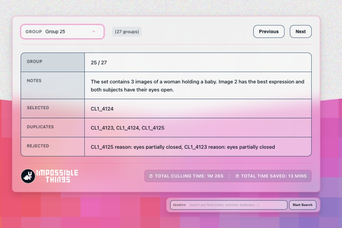 Whether you’re editing weddings, portraits, events, or anything in between, Impossible Things Culling is designed to eliminate the most time-consuming part of your workflow: sorting through thousands of images to find the best ones.