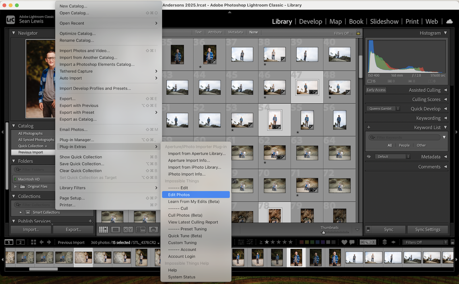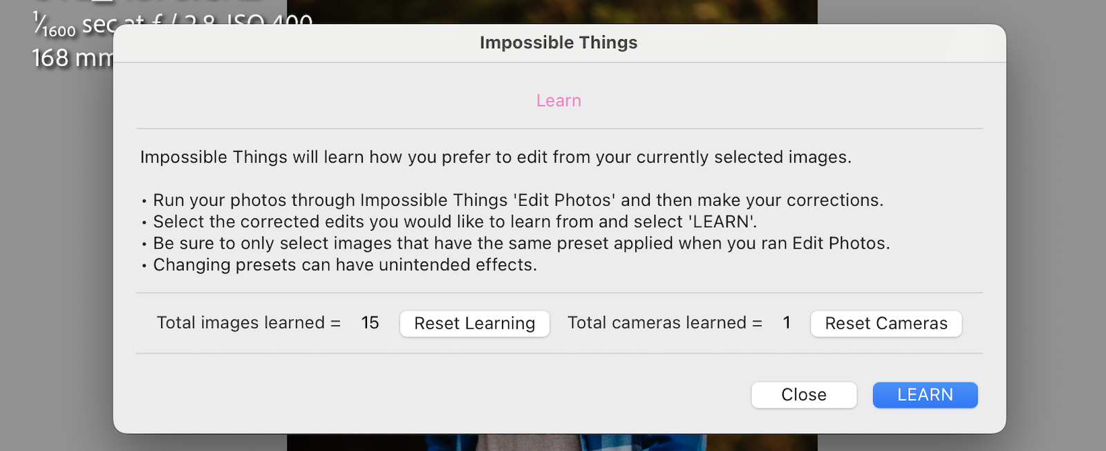Please note: Before moving on, make sure the images you want the system to learn from are actively selected. Learn From My Edits only analyzes selected images, and only those originally edited using Impossible Things.
